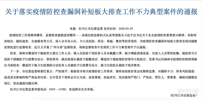 5月29日,牡丹江市紀委監(jiān)委通報稱,海林市橫道河子鎮(zhèn)政府大部分工作人員、鎮(zhèn)人民醫(yī)院個別醫(yī)務人員未佩戴口罩,缺少測溫******設備,對進入人員管控松懈。