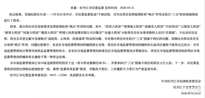 5月30日,牡丹江發(fā)布《關于市區(qū)藥店發(fā)揮疫情防控“哨點”作用不力典型案件的通報》。